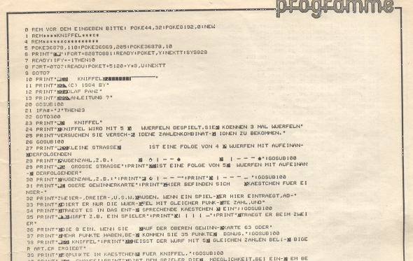 Kniffel ist für den Commodore VC-20 in Basic entwickelt worden.pen Source ;-)